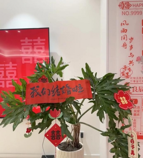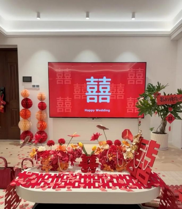 绿植上也没放过,贴上各种喜庆、美好的话语,这谁能拒绝啊~甚至连电视的画面都是喜庆的大红喜字,真是处处是小惊喜!