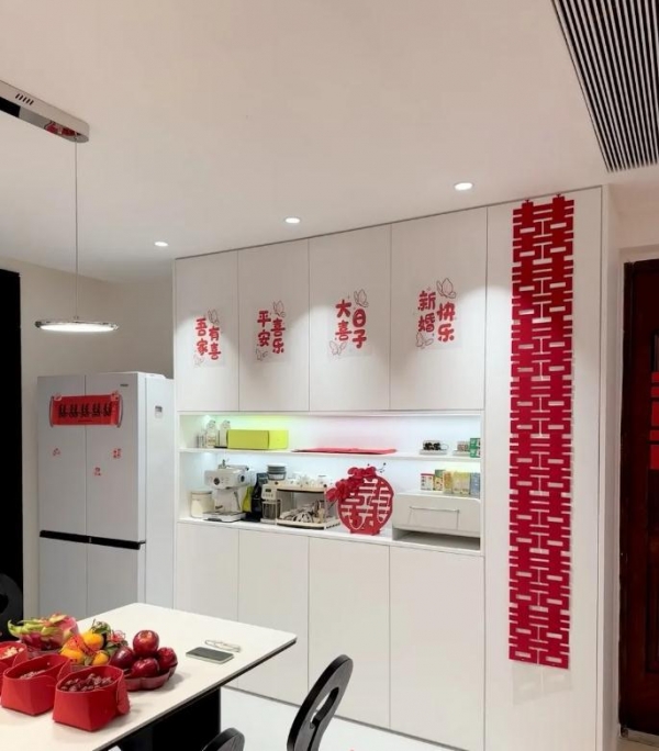 玄关柜的地方,也是贴了吉祥的话语和长长的喜字,白色的柜子点缀上红色的元素,看起来确实很干净、雅致!尤其大红喜字摆件放在柜子上,喜庆的元素就更浓郁了!