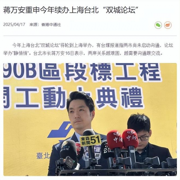 4月16日,他在台北市政会报告中再次重申:"两岸关系越艰困,越需要制度化交流。"同日,上海方面也发布消息,确认将继续派团赴台参加"双城论坛"。上海市政府官网新闻稿明确指出,双方已完成年度合作议题初步讨论,并将在经济、文化、市政管理等领域深化对接。就在这份公文正式印发的前后,蒋万安团队还向陆委会提交了续办申请材料,内容包括议题框架、预算安排以及疫情后安全防范方案。