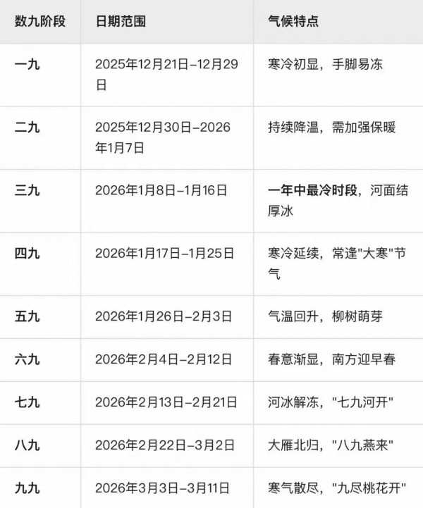 四九是中国传统"数九"习俗中的一个阶段,是指从冬至节气开始计算的第四个九天 ,即:冬至后的第28天至第36天。是一年当中最冷的时段一会,对应大寒节气。例如2026年的四九为1月17日至1月25日。