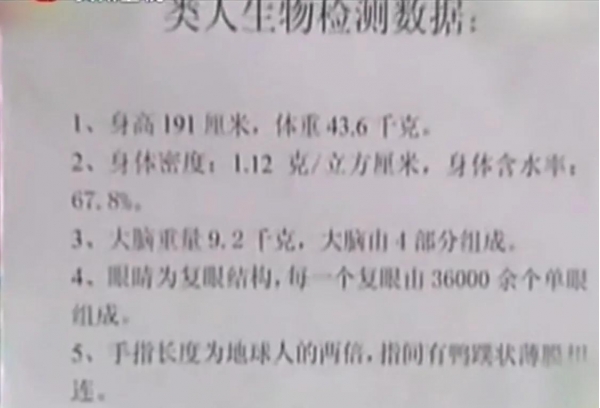 令记者奇怪的是,检测报告说得如此详细,但这个外星人却没有半点被解剖的痕迹。记者问李凯:有没有打算把它捐出去,做科学研究?李凯说:我和它已经有了感情,不想捐出去。最主要的是,我怕它的同伴会再来找我。我把它保存好,等它的同伴来了后,就还回去。