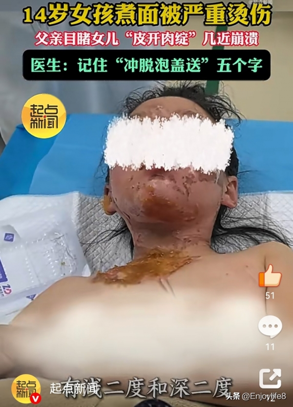 厨房里的一声惨叫,打破了陕西西安一个普通家庭的宁静。近日,一则令人心痛的新闻登上了热搜:一位14岁的女孩在家中煮面时,不慎打翻了滚烫的面汤,瞬间,高温的液体无情地浇在了她的右侧脸颊、脖子和胸口,皮肤当即皮开肉绽。