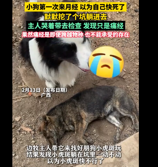2月13日(发布日期)广西,小狗第一次来月经以为自己快死了,默默挖了个坑躺进去,主人哭着带去检查发现只是痛经,果然痛经是即使跨越物种也不能承受的存在。