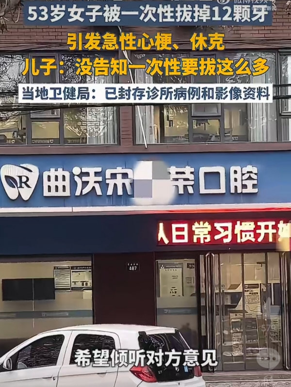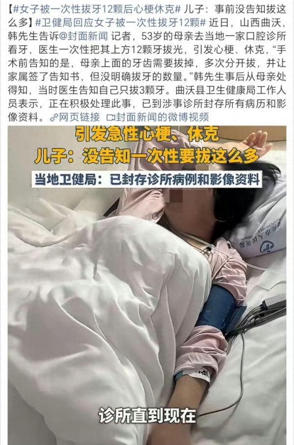 近日,山西曲沃发生一起引发关注的医疗事件。53岁的韩先生母亲前往当地一家口腔诊所看牙,医生一次性拔除其上方12颗牙,随后该女子出现心梗、休克状况。韩先生表示,手术前医生告知会分多次拔除母亲上方牙齿并让家属签了告知书,但未明确拔牙数量;而其母亲事后称当时被告知只拔3颗牙。