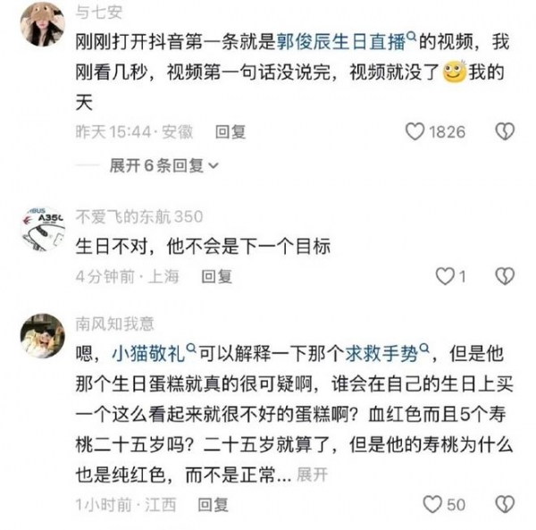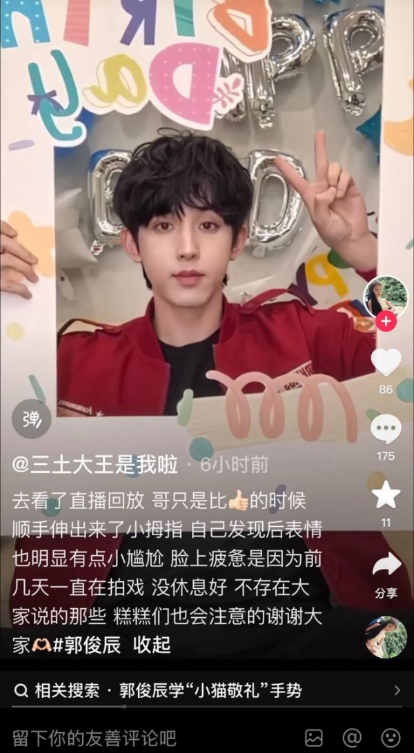 而在郭俊辰 10 月 1 日的生日直播中,他比出的手势引起了网友关注! 在其中一个互动环节,原本在饭撒的他,被指突然比出了和于朦胧一样的求救手势。