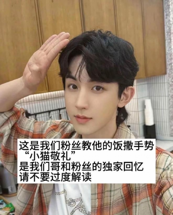 至于反手敬礼这个手势,其实是他和粉丝之间的互动,是可爱的猫咪敬礼手势,希望网友们不要过度解读。