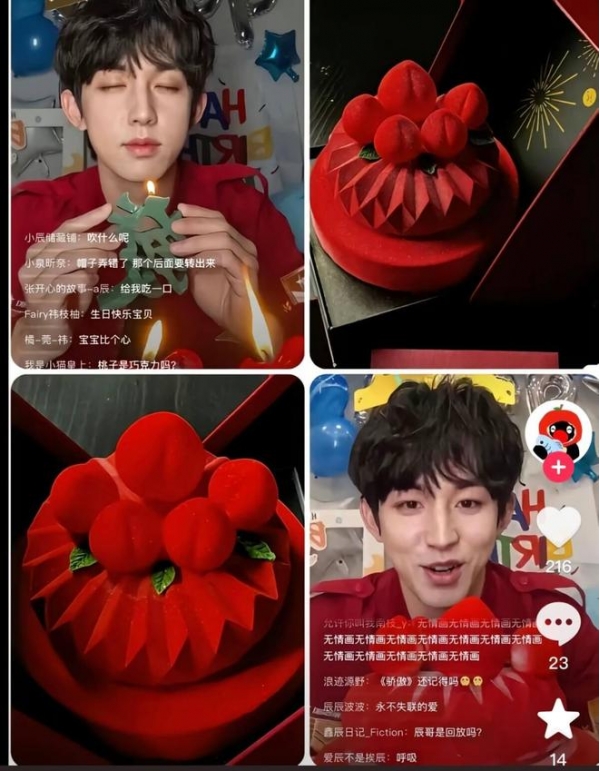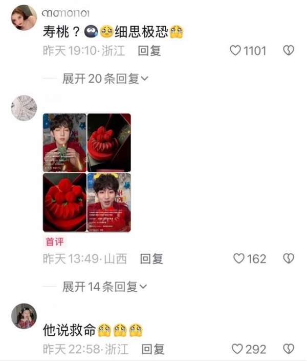 更让网友担忧的是,工作室为其准备的生日蛋糕,外型十分的诡异,鲜红色的寿桃蛋糕,怎么看怎么不舒服,而且上面的 5 个寿桃,被指有无处可逃的含义。