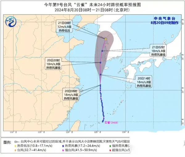预计8月21日凌晨到白天,云雀将在朝鲜半岛登陆,登陆后将转为温带气旋并向东北方向移动,逐渐减弱。