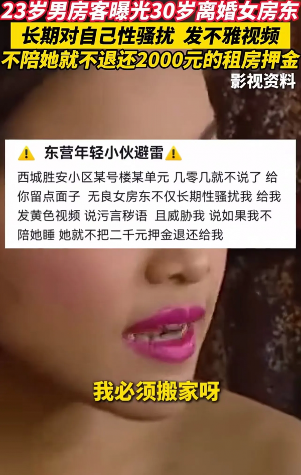 山东东营,23 岁小伙称自己长期遭 30多岁女房东骚扰,并被威胁:"不陪她睡觉就不退 2000 元押金!"男子:"不是钱多钱少的问题,她就是太恶心了!"网友;"在没看到女房东照片之前,我保持沉默!"