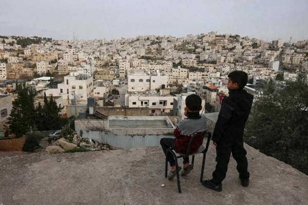 巴勒斯坦男孩们站在屋顶上眺望被以色列占领的约旦河西岸城市希伯伦