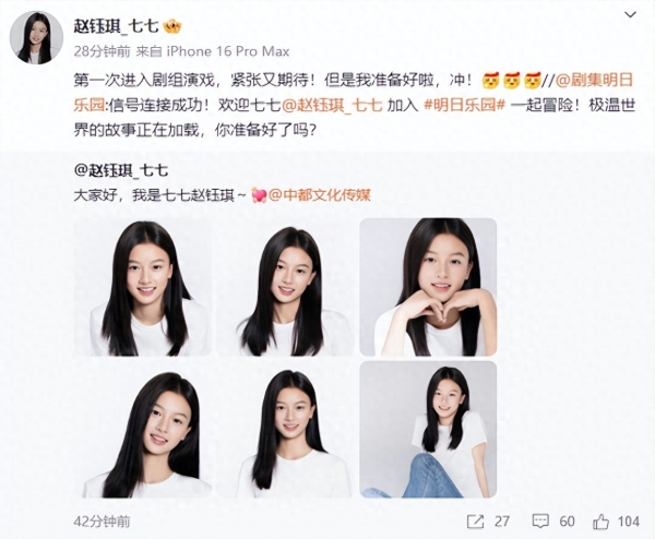 1月5日,去年因颜值走红的15岁素人女孩赵钰琪"七七"宣布已签约中都文化传媒,并正式官宣进组钟楚曦、尹昉、敖子逸领衔主演的《明日乐园》。