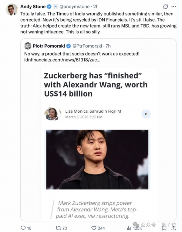 而就在前后脚的功夫,Meta发言人Andy Stone也在X上发文辟谣,否认了最近不断发酵的"亚历山大王出走"的传闻。