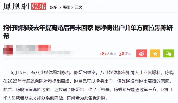 信息来源:凤凰网《狗仔曝陈晓去年提离婚后再未回家 愿净身出户并单方面拉黑陈妍希》2024-06-19
