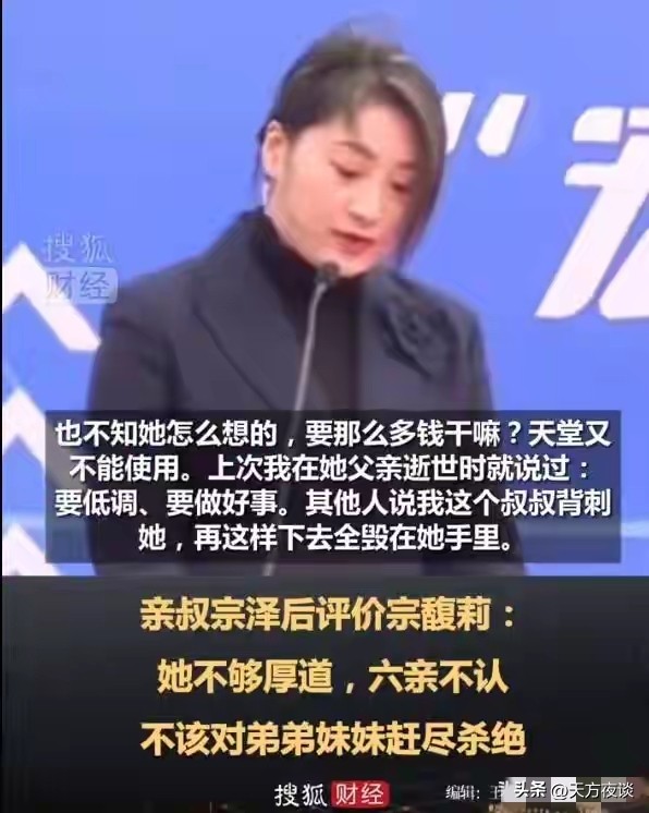 但这事儿远没那么简单。宗馥莉刚上台时,就大刀阔斧搞改革,把不少老员工的利益都动了,后来闹辞职风波,宗泽后不仅没帮侄女说话,还公开说"这是好事";再后来宗馥莉干脆和叔叔的"娃茅酒业"撇清关系,连他名下欠了钱的公司股权都给冻结了,叔侄俩的矛盾早就摆到了台面上。加上还有人说,宗泽后偷偷支持宗庆后外面的孩子争家产,这次发朋友圈"批评",更像是家族里的利益争斗,又摆到了明面上。