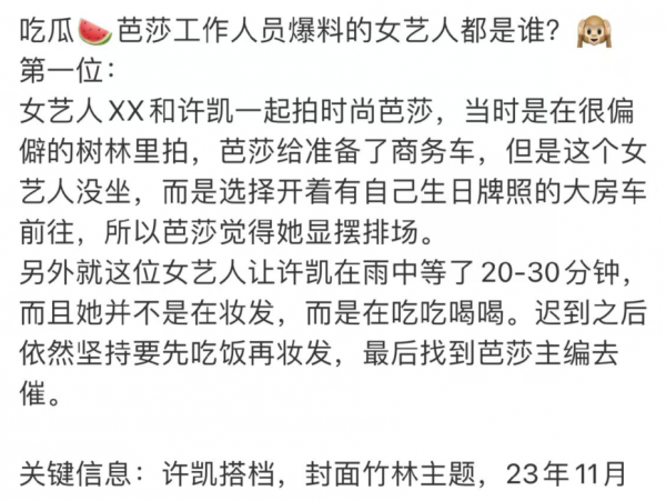 23年的11月份,许凯跟一位女明星一起拍杂志,当时拍摄地点是特意选在了很偏僻的树林里,芭莎原本给两位艺人都准备了商务车,但这个女艺人没坐,而是选择开了有自己生日牌照的大房车前往,为此芭莎的工作人员便觉得这位女艺人的排场挺大。