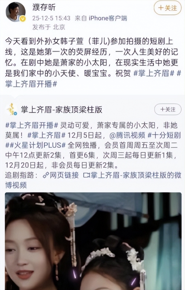 近日,72岁的老戏骨濮存昕罕见地连发布三条动态,为自己11岁的外孙女韩子萱宣传新剧,这是韩子萱出演的首部短剧,大有为外孙女壮势的派头。