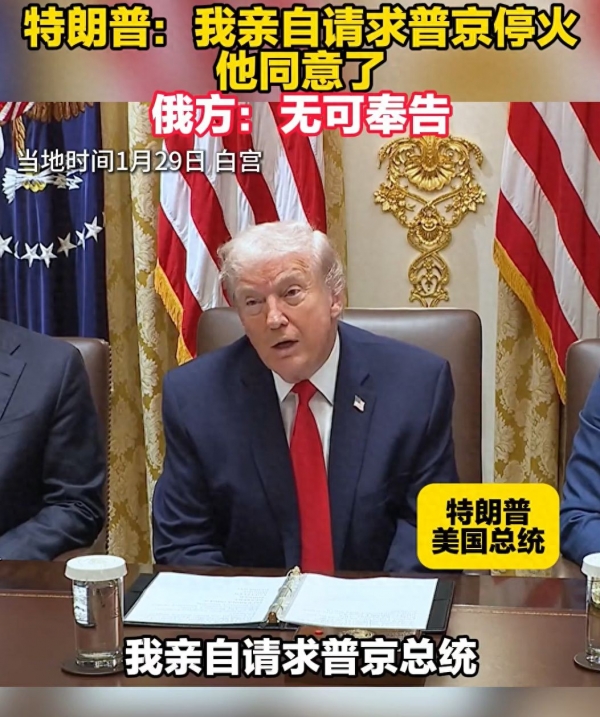 特朗普当天在白宫举行的内阁会议上说,乌克兰正遭受"极度严寒","我亲自请求普京总统在一周内不要向基辅及其他城镇开火。他同意了"。