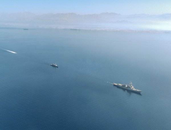 美国海军"布莱克"号驱逐舰(最右)抵达红海,与以色列海军进行联合演习