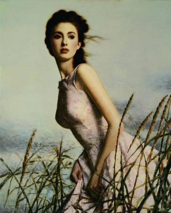 仔细看他的作品,你会发现他所画的大多为现代女性,背景为室外自然风景,女子们神态平静、空灵,她们像是存活于历史时空的"仙女"。