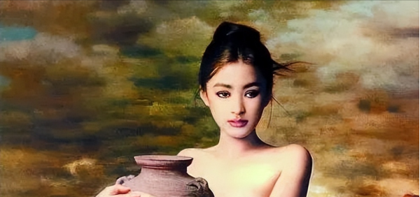 画中的女子半裸着身体,楚楚动人的抱着一只陶罐,她那美丽的面容、婀娜的身材被定格在广阔的天地间,性感又不失纯真。
