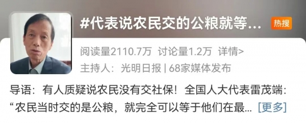 今年全国两会期间,全国人大代表雷茂端提出:"农民当时交的是公粮,就完全可以等于他们在最早的时候已经交了社保。"他建议,将70岁以上农民基础养老金每月提高到500元。