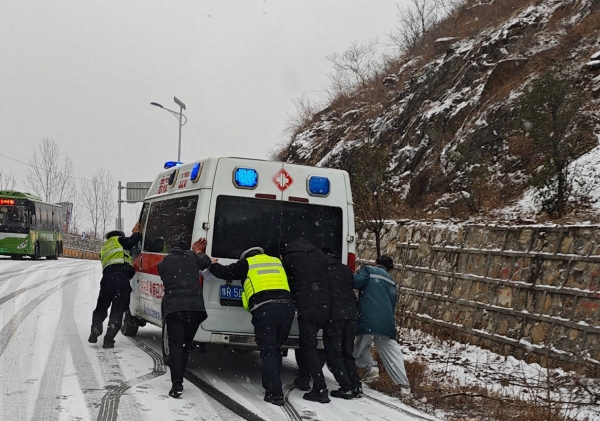 在确认救护车行驶状态正常后,巡逻民辅警又驾驶警车在前开道护航,一路谨慎引导救护车避开结冰危险路段,直至将其安全护送至平坦的主干道。看着救护车鸣笛疾驰向医院方向,民辅警们才松了口气,转身继续投入到冰雪路面巡逻和交通疏导工作中。