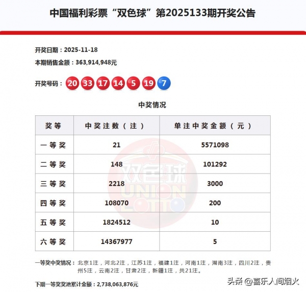 本期双色球销量为3.63 亿,筹集社会公益金 1.31亿。本期开奖前奖池有28.1亿 的资金。