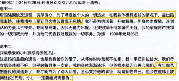 李鸿彬还将女儿离世前写的遗书交给唐莉。孙涛在遗书里写道:我可怜的女儿,妈妈要走了,我是被你爸逼死的,你以后要为我报仇。