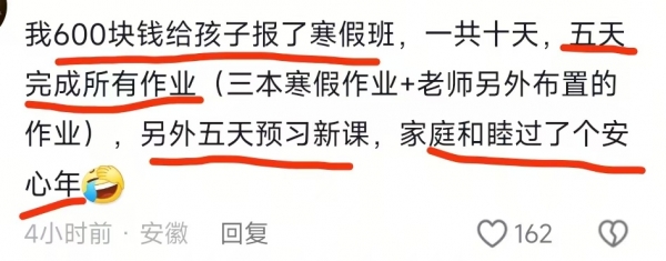 还有的家长花钱给孩子报寒假班,前五天负责完成寒假作业,后五天预习新课。