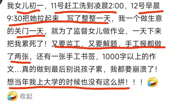 更有做生意的家长,为了孩子的寒假作业不烂尾,关门一天监督+赶工,家长怒气冲冲的表示,自己当年上大学时都没这么拼过!
