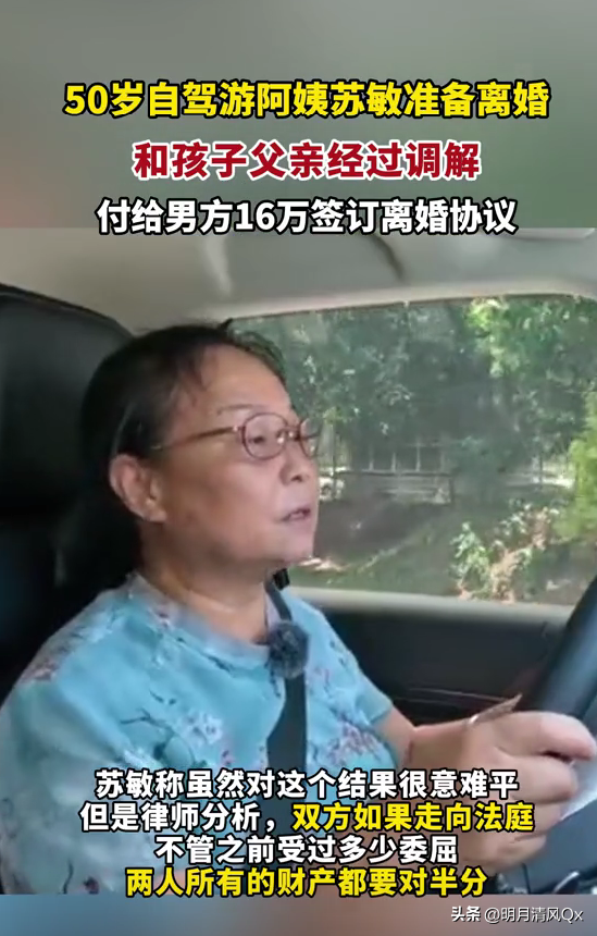 在7月15日,自驾出行的50岁苏敏阿姨在网上发布视频称:与孩子父亲调解后,最终给予丈夫16万元,并签署离婚协议。简单的声明,一下子上到了热搜。