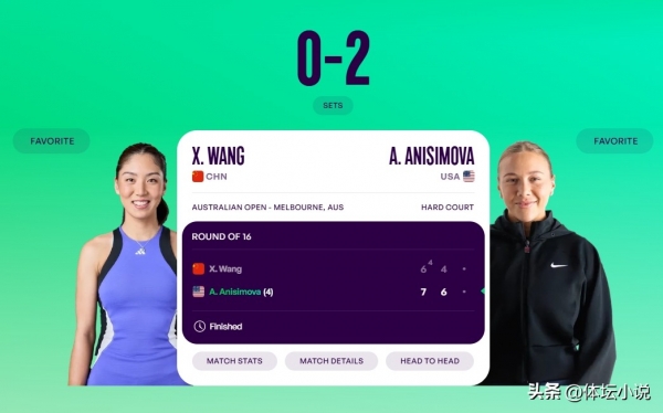 第二盘王欣瑜体能受到影响,明显跟不上对手的节奏,看来输掉第一盘让王欣瑜气势受挫,一上来就快速1-3落后,期间还申请医疗暂停,随后2-4落后3-5落后,虽然王欣瑜靠着意志力咬住比分追到4-5,但是第十局阿尼西莫娃把握计划成功爆发以6-4拿下,大比分2-0横扫王欣瑜,杀进八强,而且还是连续三个大满贯晋级八强,非常稳定!