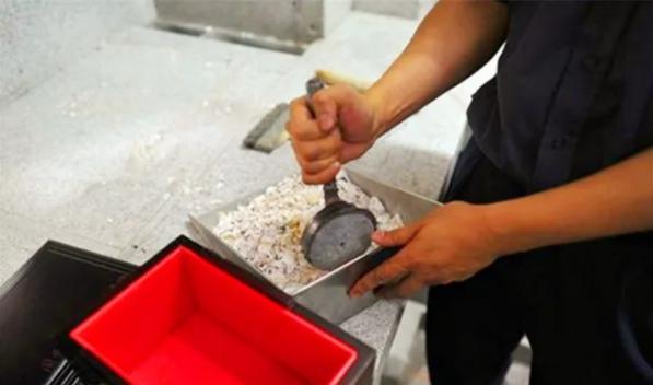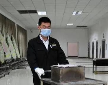 火化结束后,骨灰需自然冷却40分钟以上才能分拣,工作人员要用磁铁吸走残留的金属碎片,再将骨灰按骨骼顺序装入骨灰盒。