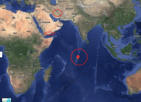(迭戈加西亚空军基地的位置,上面是也门和伊朗)