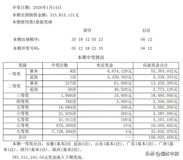 本期销售金额3.13亿元,筹集公益金1.0955亿元(按35%公益金比例计算)。周三购彩热度持续攀升,销量较上期(26005期3.11亿元)上涨0.02亿元,无专项促销活动带动,整体走势符合常规规律!本期一等奖迎来新年"好运普惠",共开出8注单注基本奖金6674129元,均未选择追加投注;二等奖共开出217注,单注奖金61900元,其中58注采用追加投注,每注多得49520元。一等奖中奖地区分布广泛,8注基本头奖分落全国多省安徽(基本2注 追加1注)、山东(基本1注)、广东(基本1注)、广西(基 本1注)、四川(基本1注)、陕西(基本2注)。各地彩友均等共享开年好运!奖池在本期开奖后滚存至787011243.54元,以7.87亿稳健奖池为后续开奖续航助力!