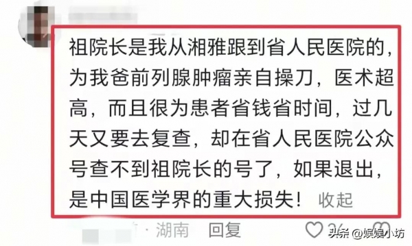 还有患者家属说,父亲的前列腺肿瘤手术是祖副院长亲自操刀,医术超群治疗效果很好,而且为很多患者省钱省时间,现在却挂不上号了,如果退出是医学界的重大损失。