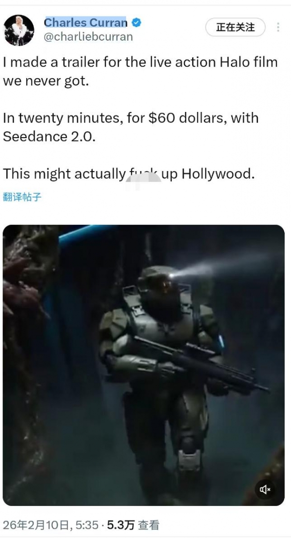 导演Charles Curran在社交平台连续发文,他为从未面世的真人电影制作了一版预告片,仅用20分钟,花费60美元,借助Seedance 2.0完成,"这玩意儿说不定真能搞砸好莱坞呢。"