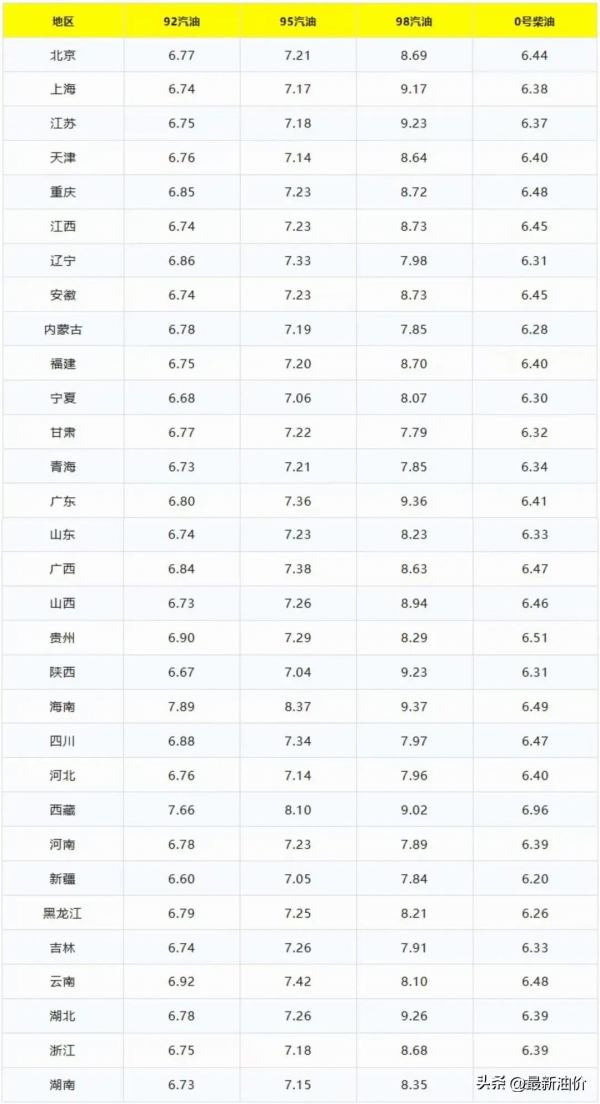 在文章的最后,今日油价最新资讯的小编就带各位车友去看看当前最新油价的报价情况。在油价上涨后,今天来到2月1日,全国各地最新的0号柴油和92、95、98号汽油价格情况(单位元/升):