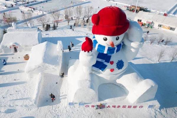 作为冰城的 "迎客大使",今年的雪人先生颜值与实力双在线。经典的欧式小礼帽镶着冰花纹路,新增的渐变粉腮红软萌吸睛,八字眉搭配微笑眼,再竖起大拇指花式比心,活脱脱一个 "冰雪暖男"。50 名雪雕匠人顶着零下低温,从清晨六点半奋战到天黑,仅用 3 天就完成雕刻,创造了雪博会最快纪录。更用心的是,雪质经过松花江水净化处理,紧实洁白,能稳稳陪伴游客度过两个月的冰雪季。