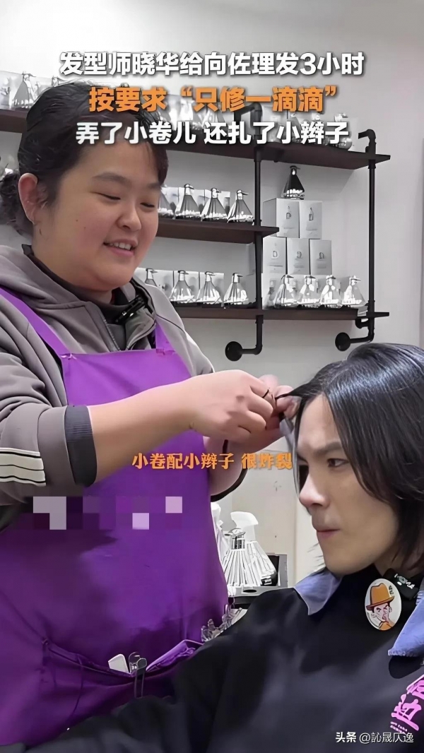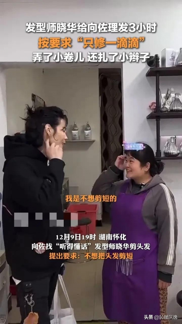 晓华老师听从了向佐的要求,按他的要求"只修一滴滴",弄了小卷儿,还扎了辫子,这样简单的操作就让晓华老师花费了3个小时,最终晓华老师也是设计出了向佐所需要的发型。