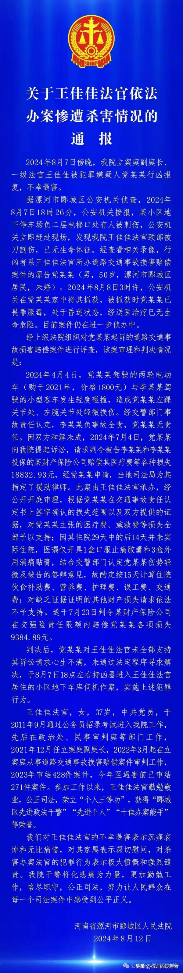 河南漯河女法官王佳佳遇害身亡的事情,在网上引发了热议。随着官方的通报发出,大家也算是明白了事情的前因后果。