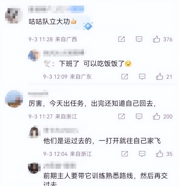 在社交媒体上,关于救助和平鸽的话题迅速走热,许多网友分享了自己的偶遇故事。一位网名"北京小菠萝"的用户评论道:"咕咕队这次真的是立大功了,而这样的经历足以让咕咕们吹上一辈子了。毕竟有的人就算想去参加阅兵,也没有这个机会。"