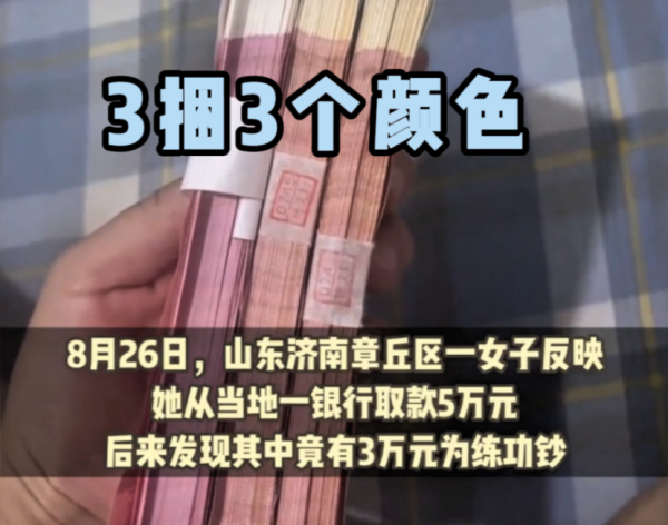 事发在山东济南章丘,当事人文女士于8月27日,向社交媒体爆料称,自己在17日去当地一家银行取款5万元现金用于发工资。文女士表示自己取出回家后一直没动过,直到8天后,在25日想要给自己的工人发工资时,却发现一沓沓的钱,检查后除了表面第一张是真的,其他都变成了练功钞,真是太不可思议了。
