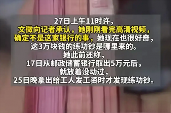 8月27日上午,据网上最新消息称该银行通过高清监控视频证明了自己的清白,而文女士经过视频确认,也承认自己当天取钱所获得钱款现金属于真钞,且练功钞并非来自该银行。这就让人很难想明白了,究竟这些练功钞是来自哪里呢?