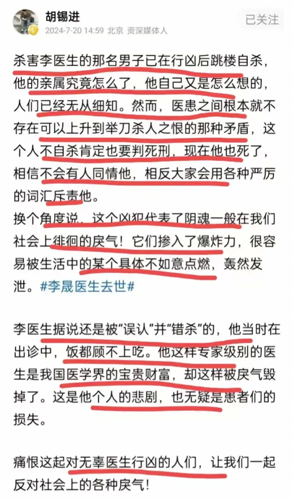 据了解李晟医生和凶手并没有任何交集,根本就不认识,之所以被害是因为被凶手认错了,被误砍了,因此无缘无故白白丢失生命。