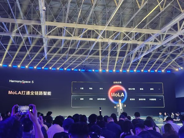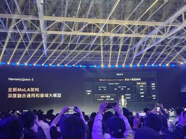 在现场,靳玉志还发布了鸿蒙座舱HarmonySpace 5,采用全新混合大模型Agent架构(Mixture of Large Model Agent,,MoLA架构),将通用大模型(DeepSeek和盘古大模型)的能力与音乐、影视等领域的AI能力进行整合,构建丰富的硬件、软件生态和多种空间的场景体验。