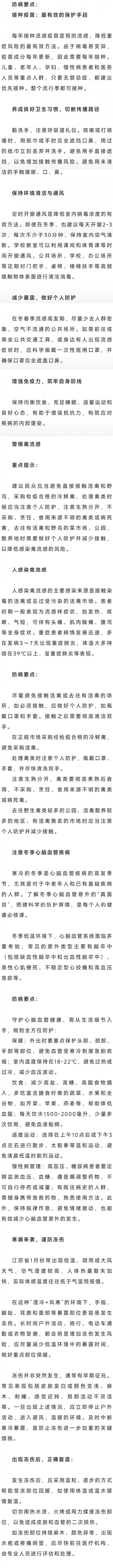 进入1月,我们迎来元旦假期,寒假的脚步也近了。江苏省疾控中心提醒,时值隆冬,气温变化大,降温、寒潮频繁,人员流动变大,室外活动减少,室内活动增多,流感、鼻病毒等呼吸道传染病仍需警惕,另外还要注意预防心脑血管疾病和冻伤,以及禽流感。