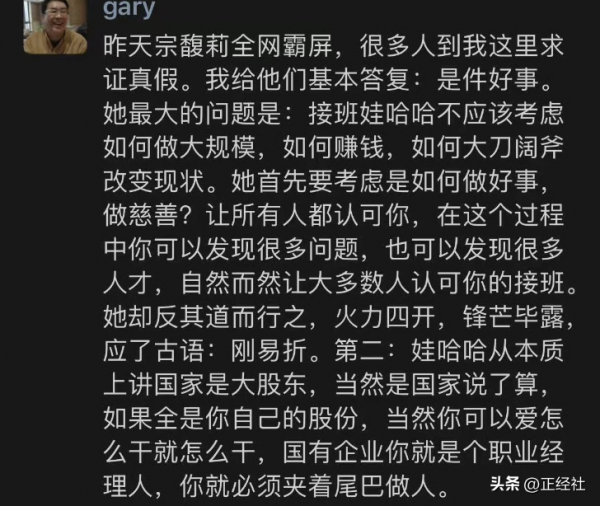 但对于亲哥哥培养拉拔了多年的亲侄女,他抛出的却不是什么好话。首先,他将宗馥莉的请辞行为定性为:"是件好事"。直接亮明了自己元老反对派的立场,全然没有顾及亲侄女请辞背后的无奈与无助,亲侄女在运营受阻、改革遇挫的此时此刻,更需要的,是来自亲情友情和有识之士的声援和关起门来的建议--比如严厉地批评她的方式方法,并给出真诚的解决方案。