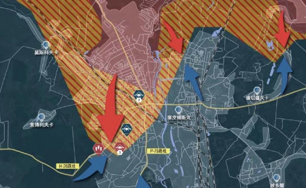 在红军城市区,随着乌军逐渐撤出铁路以南区域,红军城中心逐渐被俄军控制,俄军的控制区进一步向城市两翼扩展,导致乌军铁路线防御体系失效。