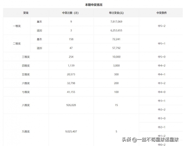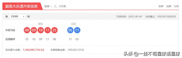 基本开奖信息,前区号码:08、09、10、11、35(4连号+凤尾35),后区号码:05、11(奇奇组合,跨度6),奖池金额:15.40亿元(滚存至下期,派奖活动持续中),中奖分布:全国中出9注一等奖(单注781万元),其中3 注追加投注额外获得625万元奖金,分落河北、黑龙江、江西、广东、重庆、四川、陕西7省。
